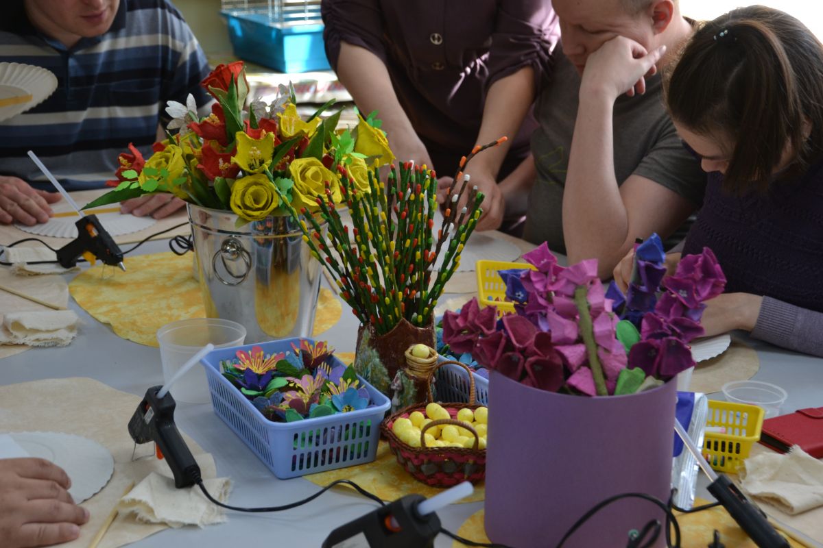 Активное участие в рамках акции «Добрый субботник» принимает и наш Центр. Так, в период с 3 по 13 апреля социально-трудовым отделением была организована акция по сбору бросового материала – бумажных ячеек для яиц, одноразовых тарелок, веточек и др., из которых затем в рамках творческих занятий «Светлая Пасха» были изготовлены очень красивые поделки.