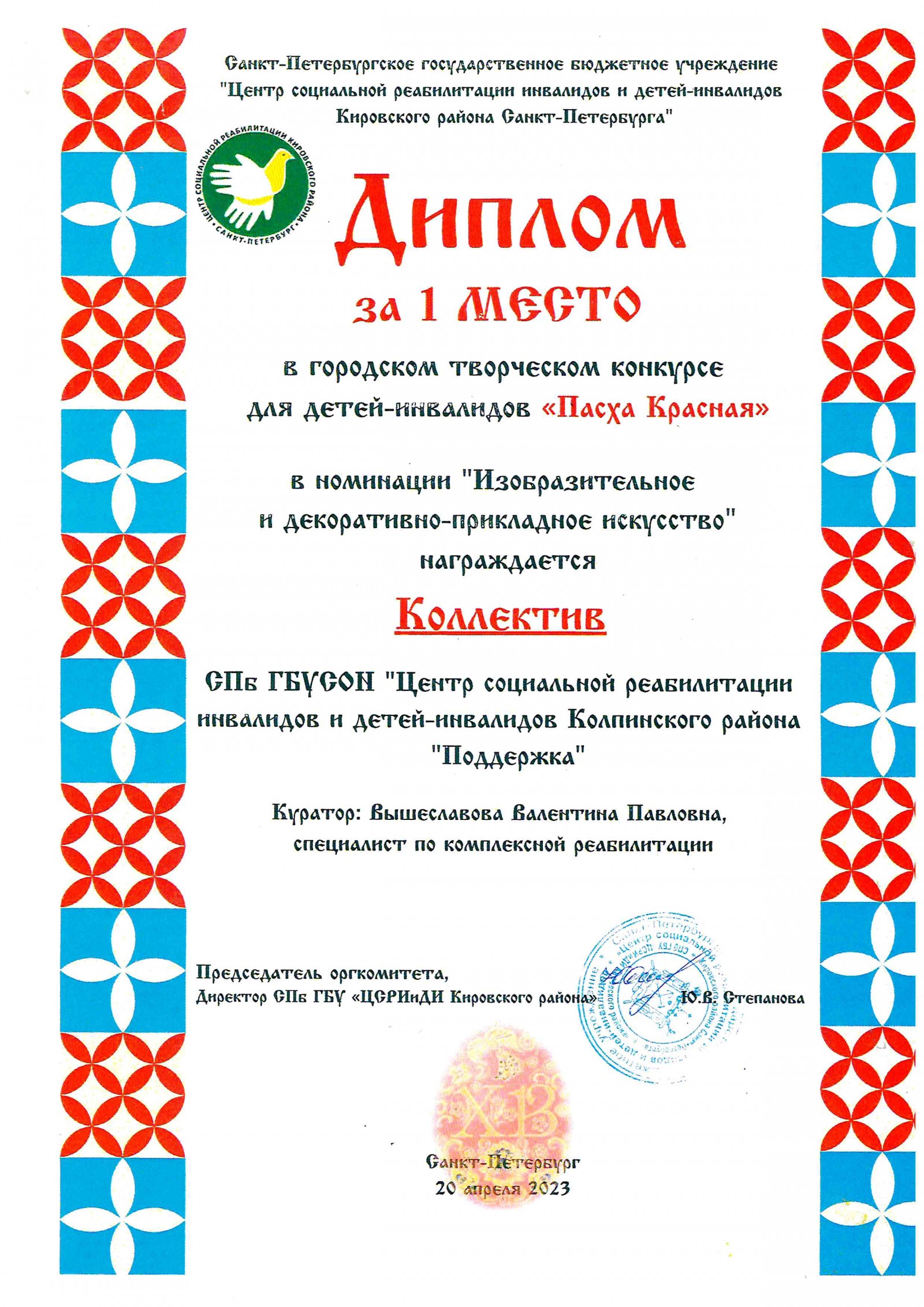 Победа в городском творческом конкурсе для детей-инвалидов «Пасха Красная» 20.04.2023![]() Дорогие друзья! 20 апреля состоялось награждение победителей городского творческого конкурса для детей-инвалидов «Пасха Красная», организованного центром социальной реабилитации Кировского района. Конкурс был приурочен к празднованию Пасхи и проводился в онлайн-формате. Мы рады поздравить наших ребят: Карандашева Максима, Маркиянову Светлану, Пащенко Веронику, Плохих Максима, Суворову Ксению (руководитель – Вышеславова Валентина Павловна, специалист по комплексной реабилитации социально-трудового отделения) с заслуженной победой в номинации «Изобразительное и декоративно-прикладное искусство». На суд профессионального жюри была представлена керамическая творческая работа «Христос Воскрес! Веры, милости, чудес!», полностью соответствующая тематике мероприятия и основным критериям оценки (композиция, оригинальность замысла, качество, эстетический вид, техника выполнения). Молодцы! Поздравляем!