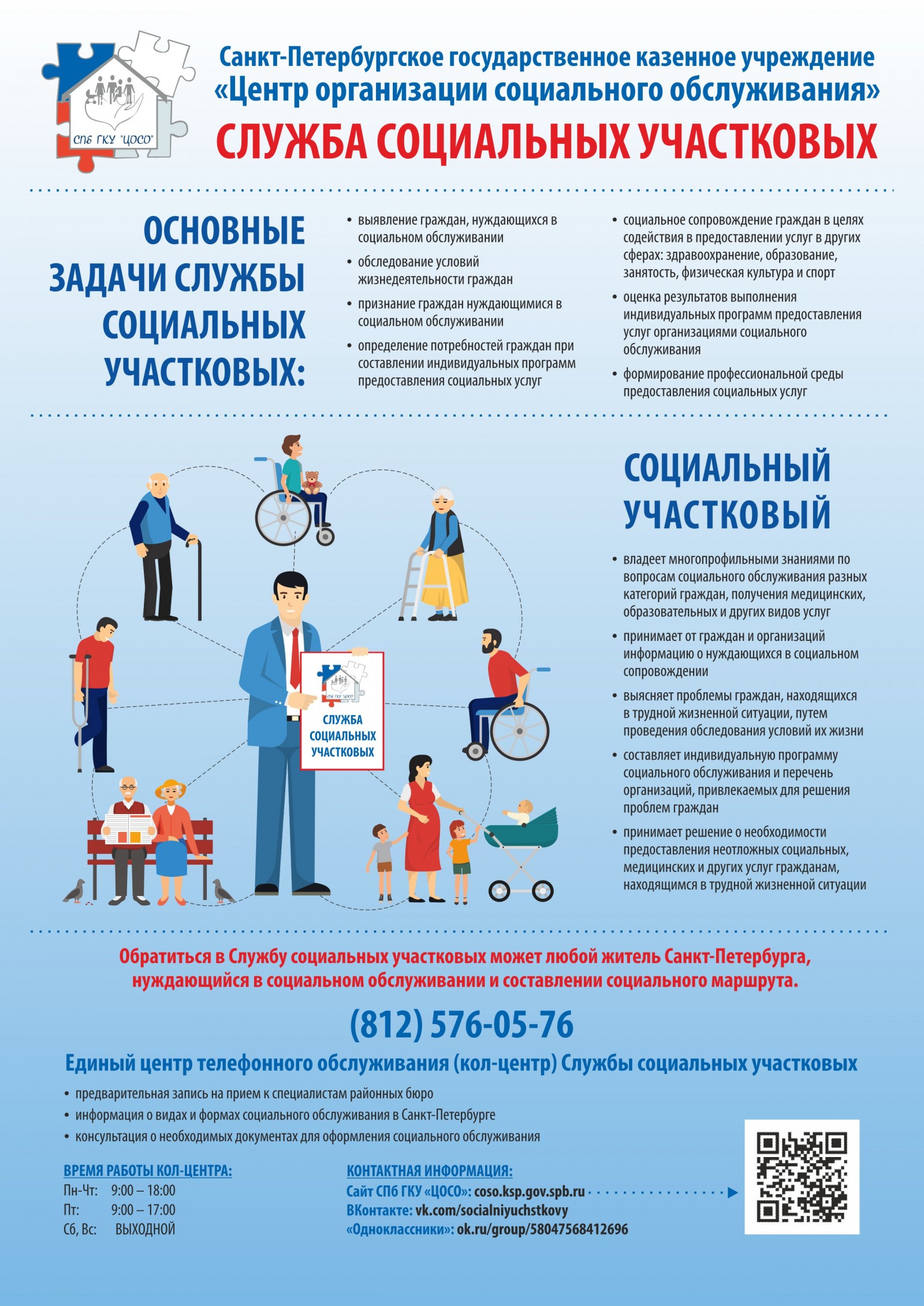 Служба социальных участковых![]() Санкт-Петербургское казенное учреждение «Центр организации социального обслуживания» Служба социальных участковых Социальные участковые – это специалисты районных бюро Санкт-Петербургского казенного учреждения «Центр организации социального обслуживания» (СПб ГКУ «ЦОСО»), подведомственного Комитету по социальной политике Санкт-Петербурга. Основные задачи социальных участковых районных бюро ЦОСО: - принимают заявления от граждан на признание нуждающимися в социальном обслуживании и составляют индивидуальную программу предоставления социальных услуг (ИППСУ); - принимают от граждан и организаций информацию о нуждающихся в социальном обслуживании (в письменном виде и по телефону кол-центра); - обеспечивают выяснение имеющихся проблем у граждан, находящихся в трудной жизненной ситуации, путем проведения обследования условий их жизни, в том числе с выездом на место, а также путем получения информации от медицинских организаций и органов местного самоуправления; - составляют социальный маршрут и определяют перечень организаций, привлекаемых Районные бюро службы социальных участковых расположены во всех районах города. На базе СПб ГКУ «ЦОСО» работает Единый центр телефонного обслуживания Кол-центр доступен для обращений граждан без перерыва на обед по будним дням с 9-00 до 18-00 с понедельника по четверг к с 9-00 до 17-00 в пятницу. Операторы кол-центра осуществляют запись на приём к специалистам районных бюро для подачи документов, консультируют по вопросам организации социального обслуживания, пакету необходимых документов для составления индивидуальной программы и другим социальным вопросам. Также существует возможность обращения через официальный сайт СПб ГКУ «ЦОСО» http://coso.ksp.gov.spb.ru или официальную страницу в социальной сети https://vk.com/socialniyuchstkovy Для повышения осведомленности граждан Санкт-Петербурга об услугах, предоставляемых в государственных учреждениях и негосударственных организациях, оказывающих социальные услуги, о системе социального обслуживания и порядке получения услуг создан интернет-портал Навигатор социальных услуг Санкт-Петербурга - https://cosospb.ru Единый центр телефонного обслуживания (кол-центр) (812) 576-05-76 |