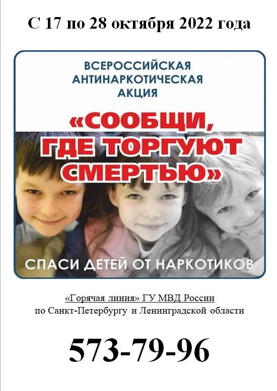 На территории Санкт-Петербурга и Ленинградской области с 17 по 28 октября 2022 года проводится 2 этап Общероссийской акции «Сообщи, где торгуют смертью».