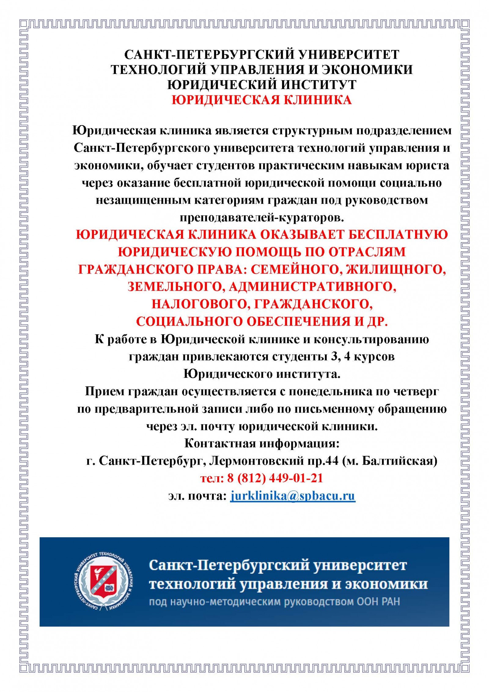 Бесплатное юридическое консультирование![]() Юридическая клиника осуществляет бесплатное первичное консультирование адресной юридической помощи социально незащищенным категориям граждан. Приём граждан осуществляется заведующим юридической клиники, преподавателями СПбУТУиЭ совместно со студентами Юридического института в периоды учебных семестров.