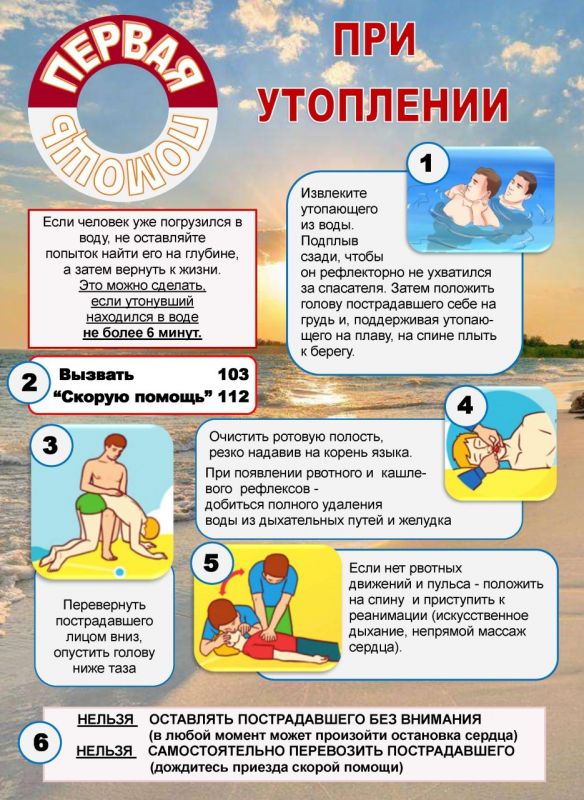 Правила оказания первой помощи: Если тонет человек: 1. сразу громко зовите на помощь: «Человек тонет!»; 2. попросите вызвать спасателей и «скорую помощь»; 3. бросьте тонущему спасательный круг, длинную веревку с узлом на конце; 4. если хорошо плаваете, снимите одежду и обувь и вплавь доберитесь до тонущего. Заговорите с ним. Если услышите адекватный ответ, смело подставляйте ему плечо в качестве опоры и помогите доплыть до берега. Если же утопающий находится в панике, схватил вас и тащит за собой в воду, применяйте силу. Если освободиться от захвата вам не удается, сделайте глубокий вдох и нырните под воду, увлекая за собой спасаемого. Он обязательно отпустит вас. Если утопающий находится без сознания, можно транспортировать его до берега, держа за волосы. Если тонешь сам: 1. не паникуйте; 2. снимите с себя лишнюю одежду, обувь, кричи, зови на помощь; 3. перевернитесь на спину, широко раскиньте руки, расслабьтесь, сделайте несколько глубоких вдохов; 4. прежде, чем пойти купаться, не забудьте взять с собой английскую булавку. Она поможет вам, если в воде начнутся судороги. Если же у вас свело ногу, а булавки при себе нет, ущипните несколько раз икроножную мышцу. Если это не помогает, крепко возьмитесь за большой палец ноги и резко выпрямите его. Плывите к берегу. Если Вы захлебнулись водой: 1. не паникуйте, постарайтесь развернуться спиной к волне; 2. прижмите согнутые в локтях руки к нижней части груди и сделайте несколько резких выдохов, помогая себе руками; 3. затем очистите от воды нос и сделайте несколько глотательных движений; 4. восстановив дыхание, ложитесь на живот и двигайтесь к берегу; 5. при необходимости позовите людей на помощь. Правила оказания помощи при утоплении: 1. перевернуть пострадавшего лицом вниз, опустить голову ниже таза; 2. очистить ротовую полость; 3. резко надавить на корень языка; 4. при появлении рвотного и кашлевого рефлексов - добиться полного удаления воды из дыхательных путей и желудка; 5. если нет рвотных движений и пульса - положить на спину и приступить к реанимации (искусственное дыхание, непрямой массаж сердца). При появлении признаков жизни - перевернуть лицом вниз, удалить воду из легких и желудка; 6. вызвать “Скорую помощь”; 7. если человек уже погрузился в воду, не оставляйте попыток найти его на глубине, а затем вернуть к жизни. Это можно сделать, если утонувший находился в воде не более 6 минут. Нельзя: