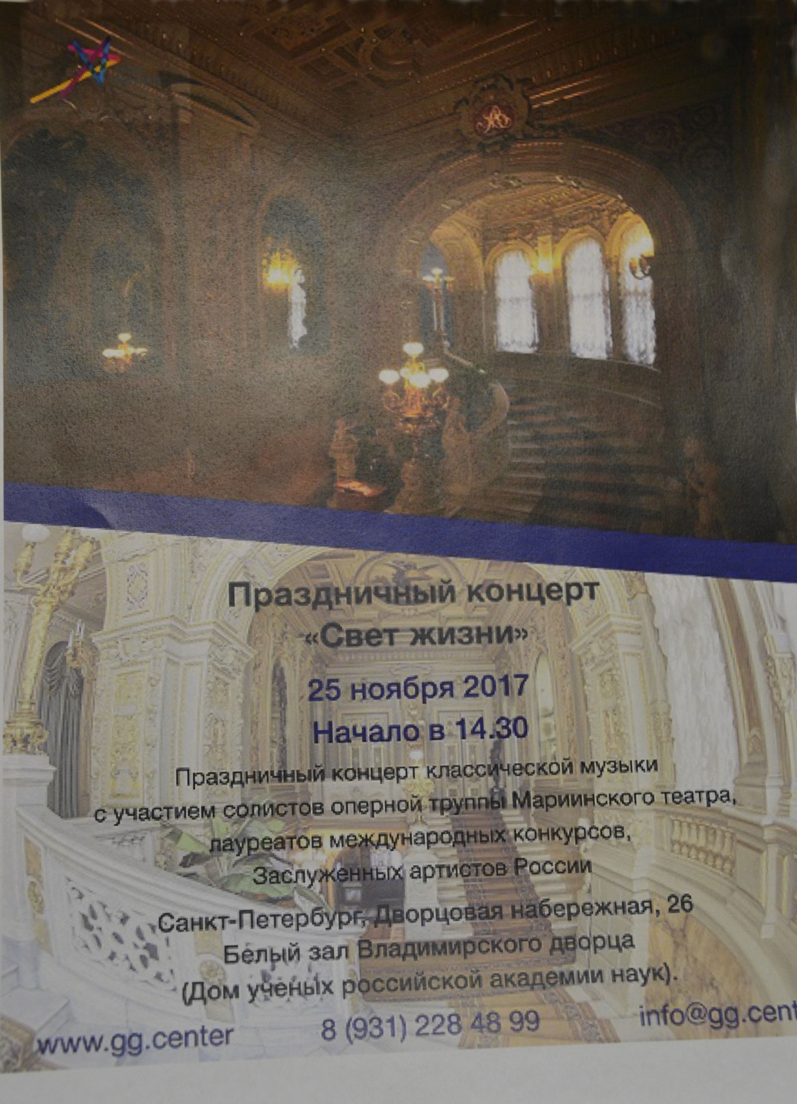 25 ноября 2017 года в Санкт-Петербурге пройдет Праздник "Свет жизни"Праздник проходит при поддержки Комитета по социальной политике Санкт-Петербурга. В программе: 1. В выставочном пространстве Санкт-Петербургского союза художников пройдут 20 обучающих интерактивных мастер-классов для детей дошкольного и младшего школьного возраста, пришедших с мамами на праздник "Свет жизни", по скульптуре, каллиграфии, песчаной анимации, акварели, росписи по ткани. 2. В выставочных залах Владимирского дворца (Дом ученых российской академии наук) откроется вернисаж художественной выставки "7Я" православной династии Кондуровых. 3. Праздничный концерт классической музыки с участием солистов оперной труппы Мариинского театра, лауреатов международных конкурсов, Заслуженных артистов России состоится в Белом зале Владимирского дворца (Дом ученых российской академии наук).