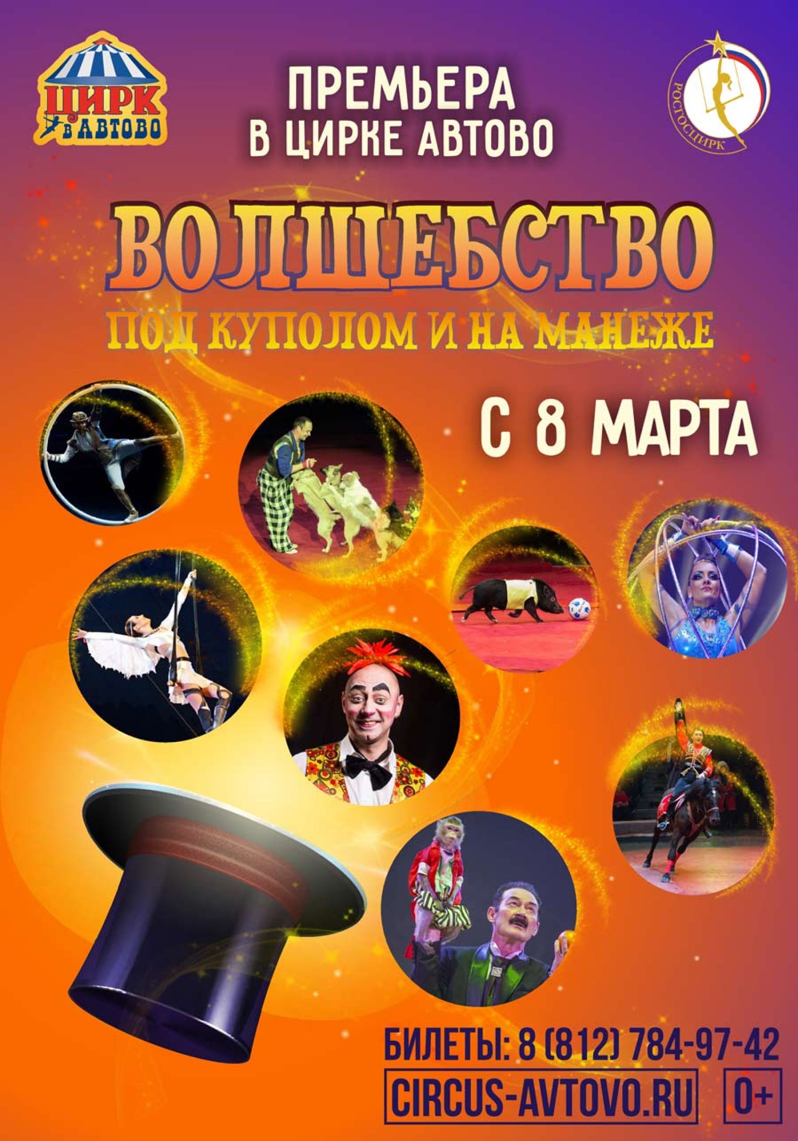 Цирк в Автово приглашает...![]() Дорогие друзья! Этой весной с 8 марта и в дни школьных каникул цирк АВТОВО представляет новую уникальную программу «Волшебство под куполом и на манеже». ЦЕНА билета - 500 руб. ЗАКАЗ БИЛЕТОВ: Владимир +7-906-241-11-97 Каждый номер новой программы - это мини спектакль, в котором артисты бесстрашно покоряют высоту под самым куполом и с легкостью захватывают внимание зрителей на манеже. Воздушный эквилибр, акробатика на полотнах, метаморфозы, дрессированные обезьяны, поросята-футболисты, веселые дворняги и многое другое! Впервые на манеже - единственное в Петербурге световое шоу «Dream in the sky»: новейшие световые технологии в сочетании с трюками на джамперах, головокружительное вращение на колесе сира - всё это не оставит равнодушными ни больших, ни маленьких зрителей! Настоящим украшением программы станет Конно-хореографический ансамбль «Иристон» под руководством Махабека Канукова. По манежу вихрем пронесутся джигиты верхом на лошадях. Смелые и ловкие наездники исполнят традиционные трюки цирковой джигитовки. Яркий темперамент, прекрасная хореография и красивые костюмы придают номеру особый колорит. Всё представление на манеже – клоун Роман Бойко. Встречайте весну в цирке АВТОВО с новой программой «Волшебство под куполом и на манеже»! Расписание представлений на МАРТ: 8 марта(пятница)-12.00, 8 марта(пятница)-16.00. 9 марта(суббота)-12.00, 9 марта(суббота)-16.00. 10 марта(воскресенье)-12.00, 10 марта(воскресенье)-16.00. 16 марта(суббота)-14.00, 16 марта(суббота)-17.30. 17 марта(воскресенье)-12.00, 17 марта(воскресенье)-16.00. 23 марта(суббота)-14.00, 23 марта(суббота)-17.30. 24 марта(воскресенье)-12.00, 24 марта(воскресенье)-16.00. 27 марта(среда)-18.30. 29 марта(пятница)-18.30. 30 марта(суббота)-14.00, 30 марта(суббота)-17.30. 31 марта(воскресенье)-12.00, 31 марта(воскресенье)-16.00. Расписание представлений на АПРЕЛЬ: 6 апреля(суббота)-14.00, 6 апреля(суббота)-17.30. 7 апреля(воскресенье)-12.00, 7 апреля(воскресенье)-16.00. 13 апреля(суббота)-14.00, 13 апреля(суббота)-17.30. 14 апреля(воскресенье)-12.00, 14 апреля(воскресенье)-16.00