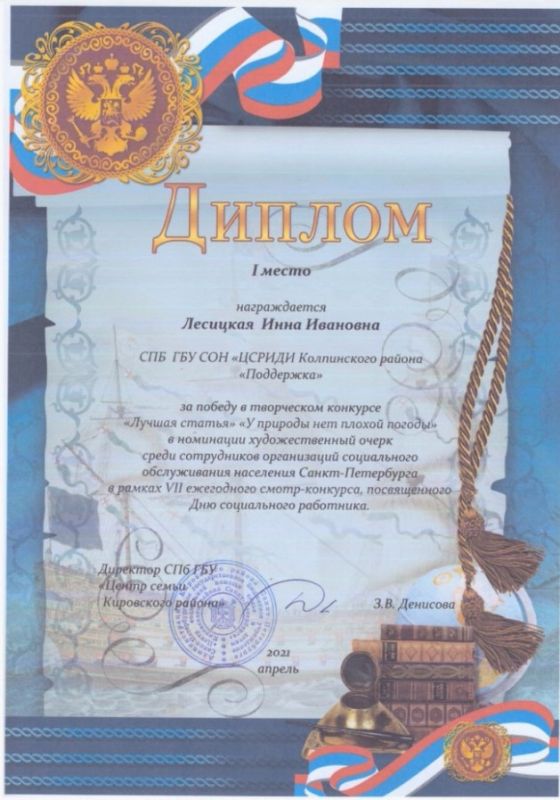 Дорогие друзья! Продолжается участие наших специалистов в VII ежегодном смотре-конкурсе, посвященном празднованию Дня социального работника. Вчера были подведены итоги конкурса творческих работ «Лучшая статья» на тему: «У природы нет плохой погоды» (на примере Санкт-Петербурга) среди сотрудников организаций социального обслуживания населения Санкт-Петербурга. Всего участвовало 29 человек из 19 учреждений города. Мы рады сообщить, что победителем стала Лесицкая Инна Ивановна, специалист по социальной работе организационно-методического отделения нашего Центра! Поздравляем и желаем новых творческих успехов!