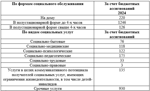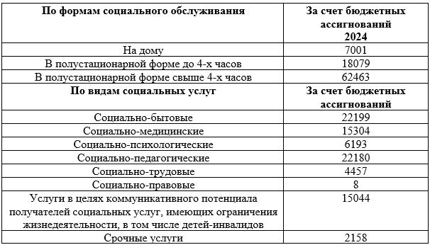 Сведения о численности получателей социальных услуг по формам социального обслуживания и видам социальных услуг за счет бюджетных ассигнований представлены в следующей таблице: