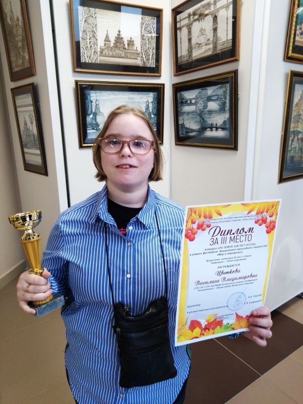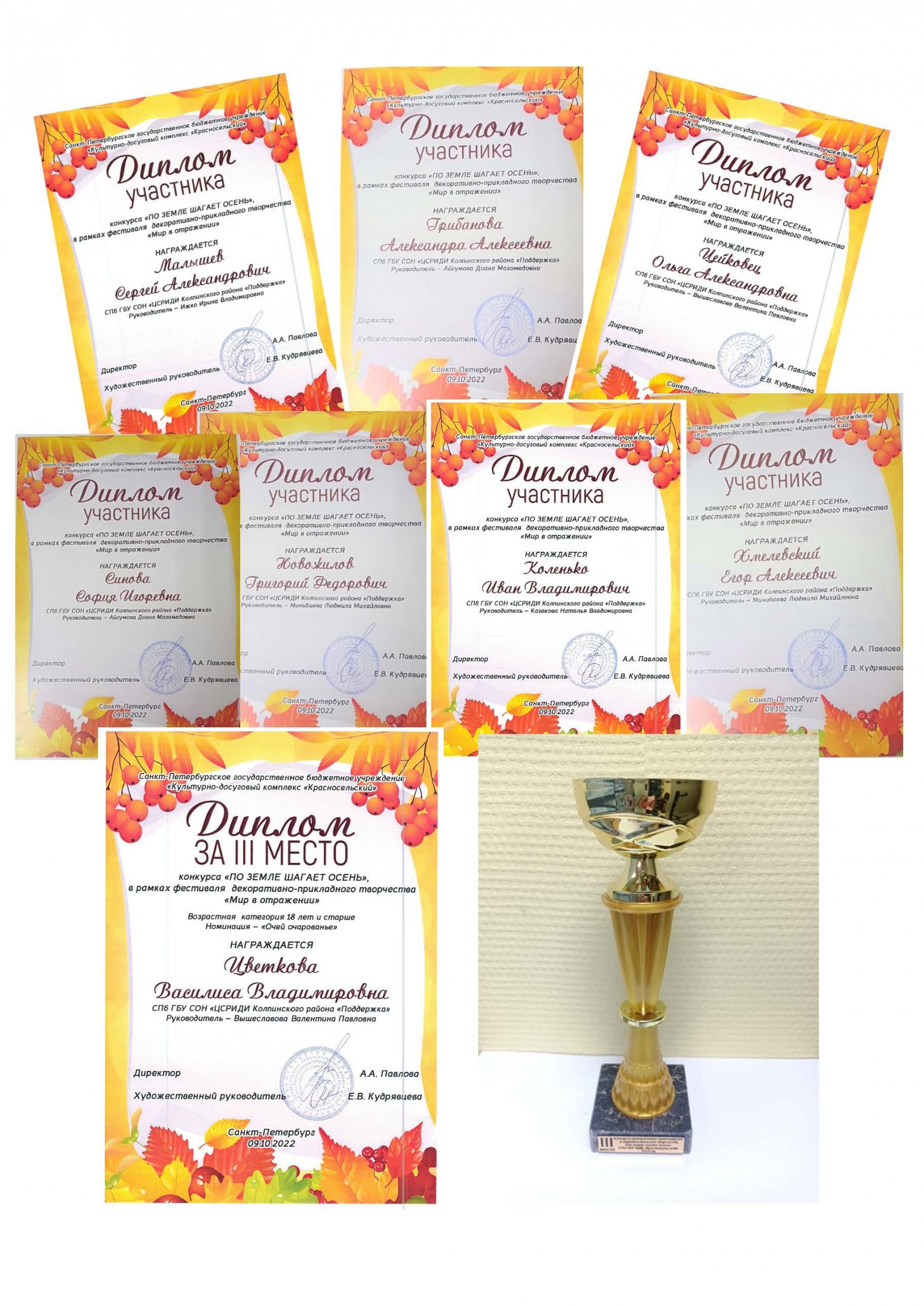 Призовое место в конкурсе «По земле шагает осень»![]() 9 октября в культурно-досуговом комплексе «Красносельский» состоялось награждение победителей конкурса , проходящего в рамках фестиваля декоративно-прикладного и художественного творчества «Мир в отражении». К участию в конкурсе принимались только индивидуальные работы по номинациям: - «Очей очарование» (осенние картины, панно, аппликации). - «Цветочный вальс» (осенние букеты, икебана, прочие букеты). - «Волшебная сказка» (лесные жители). Жюри оценивало работы по соответствию теме конкурса, а также оригинальности, аккуратности, индивидуальному стилю автора. Наши ребята под руководством специалистов Центра приняли активное участие, проявив свою фантазию и мастерство в различных техниках. Мы рады сообщить, что Василиса Цветкова (рук. – Вышеславова Валентина Павловна, специалист по комплексной реабилитации социально-трудового отделения) заняла 3 место в номинации «Очей очарование», возрастная категория 18+. Мы поздравляем Василису и желаем новых творческих идей и вдохновения!