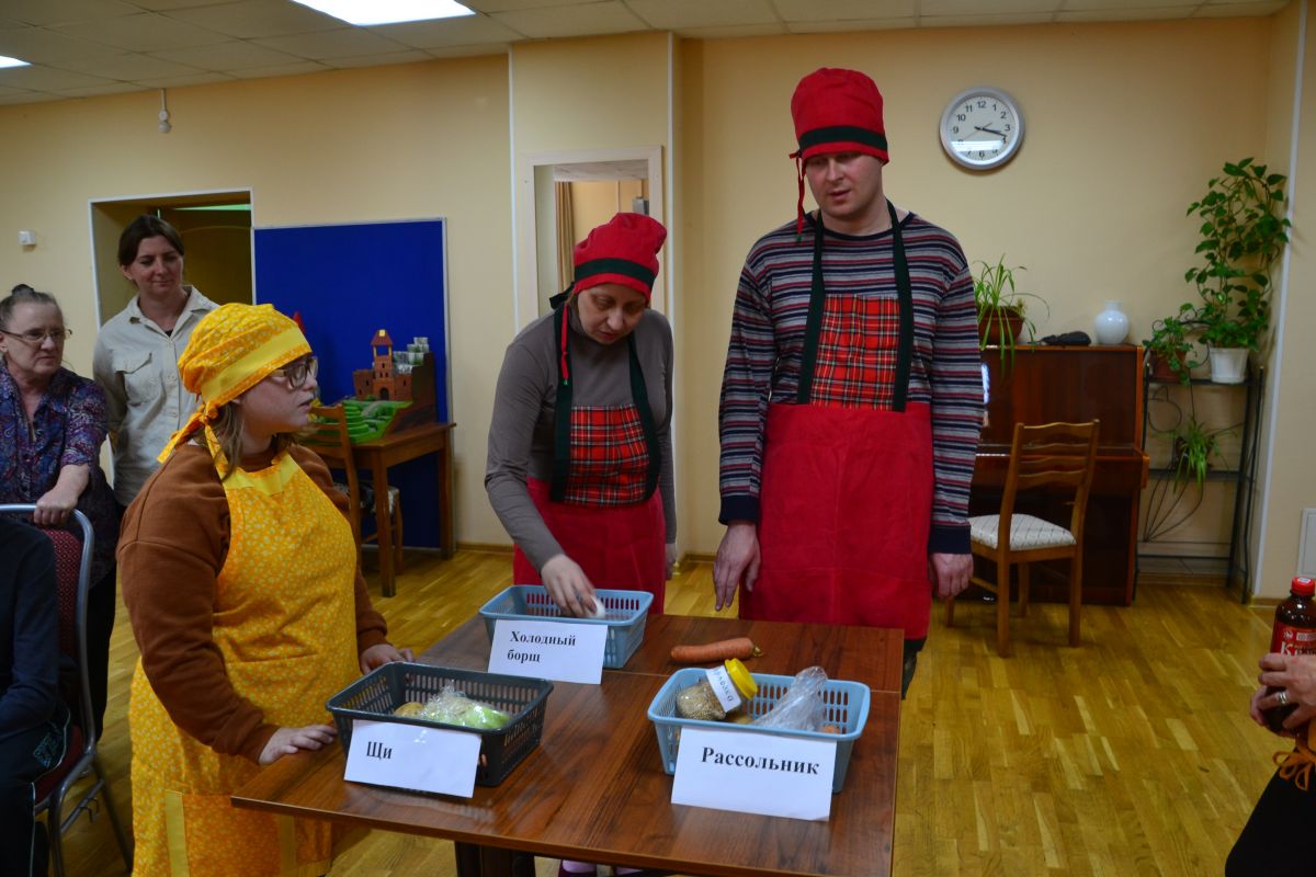 Ребята поучаствовали в различных кулинарных конкурсах: «Готовим суп» - из представленных продуктов нужно было выбрать те, которые необходимы для приготовления заявленного супа, «Назови меня» - участники показали свои знания о мучных изделиях и русских напитках, «Догадайся как…» - определяли, как и чем можно почистить овощи и фрукты.