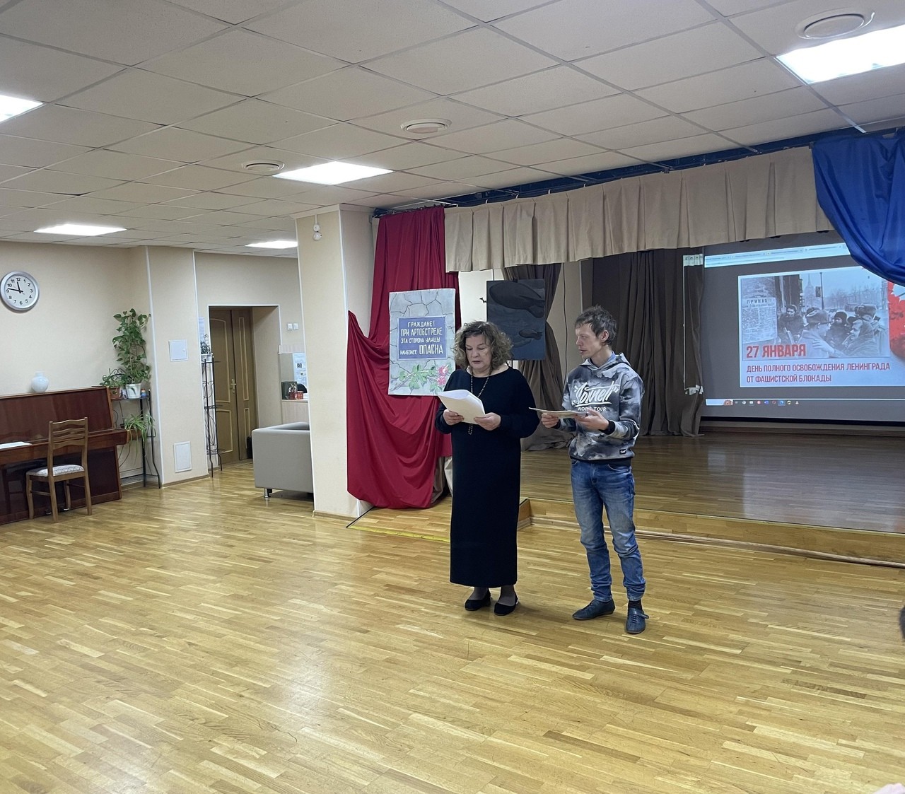 Литературно-музыкальная композиция «Дети блокады»![]() Блокада Ленинграда, длившаяся 872 дня, с 8 сентября 1941 года по 27 января 1944 года — один из наиболее трагических периодов в истории Великой Отечественной войны. Подвиг ленинградцев стал ярким примером стойкости и героизма советского народа в борьбе с фашизмом. 27 января — день, когда Ленинград был полностью освобождён от блокады в 1944 году, — является одним из дней воинской славы России. В этот день по радио зачитали приказ Военного совета Ленинградского фронта, в котором говорилось о полном освобождении Ленинграда от блокады. В честь одержанной победы в городе прогремел салют в 24 артиллерийских залпа из 324 орудий. 22 января на Бульваре Трудящихся д. 33 к. 3 состоялась литературно-музыкальная композиция «Дети блокады», посвящённая 81 годовщине со дня полного освобождения Ленинграда от фашистской блокады. Ведущий (специалист по комплексной реабилитации Ирина Николаевна Белехова) рассказала ребятам о блокаде Ленинграда, о том, как в страшное военное время, наполненное ежедневными обстрелами, голодом и холодом жили, а точнее выживали юные Ленинградцы. Дети осаждённого города наряду со взрослыми работали на заводах, ходили на реку за водой, разбирали завалы, дежурили ночами на смотровых вышках и даже успевали учиться… Многим из них не суждено было выжить. Атмосфера мероприятия была очень волнующей и проникновенной. Со сцены прозвучали стихи и песни блокадного города. Ребята, посещающие социально-трудовое отделение увидели кинохронику тех лет, документальные снимки Ленинграда, суровые факты из жизни детей блокадного города, прослушали симфонию №7 «Ленинградская» Д. Шостаковича, написанную им в осаждённом городе. Участники мероприятия читали воспоминания людей, которые в годы блокады были детьми, слушали рассказы о том, как дети вместе со взрослыми тушили, сбрасывали с крыш домов зажигательные бомбы, как работали на огородах и площадях города. В заключение мероприятия все присутствующие почтили память ленинградцев, погибших во время блокады, минутой молчания. После занятия ребята в сопровождении специалистов прошествовали к стеле «Город воинской славы», где приняли участие в торжественном мероприятии и возложили цветы к Вечному огню. Проведение таких мероприятий ещё одна возможность выразить свою признательность и уважение людям, пережившим ужасы Великой отечественной войны. Мы должны помнить об этом страшном периоде, чтобы такое больше никогда не повторилось!