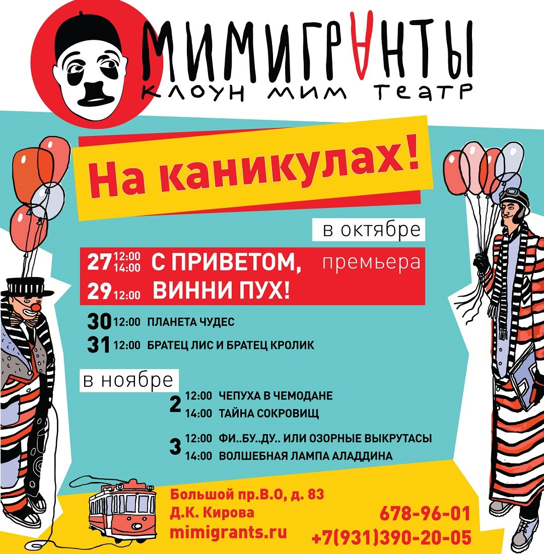 "Мимигранты клоун-мим-театр" приглашает....![]() Внимание! Предлагаем Вам репертуар для бронирования льготных билетов. Просим обратить внимание: Цена 1 льготного билета – 300 рублей.
