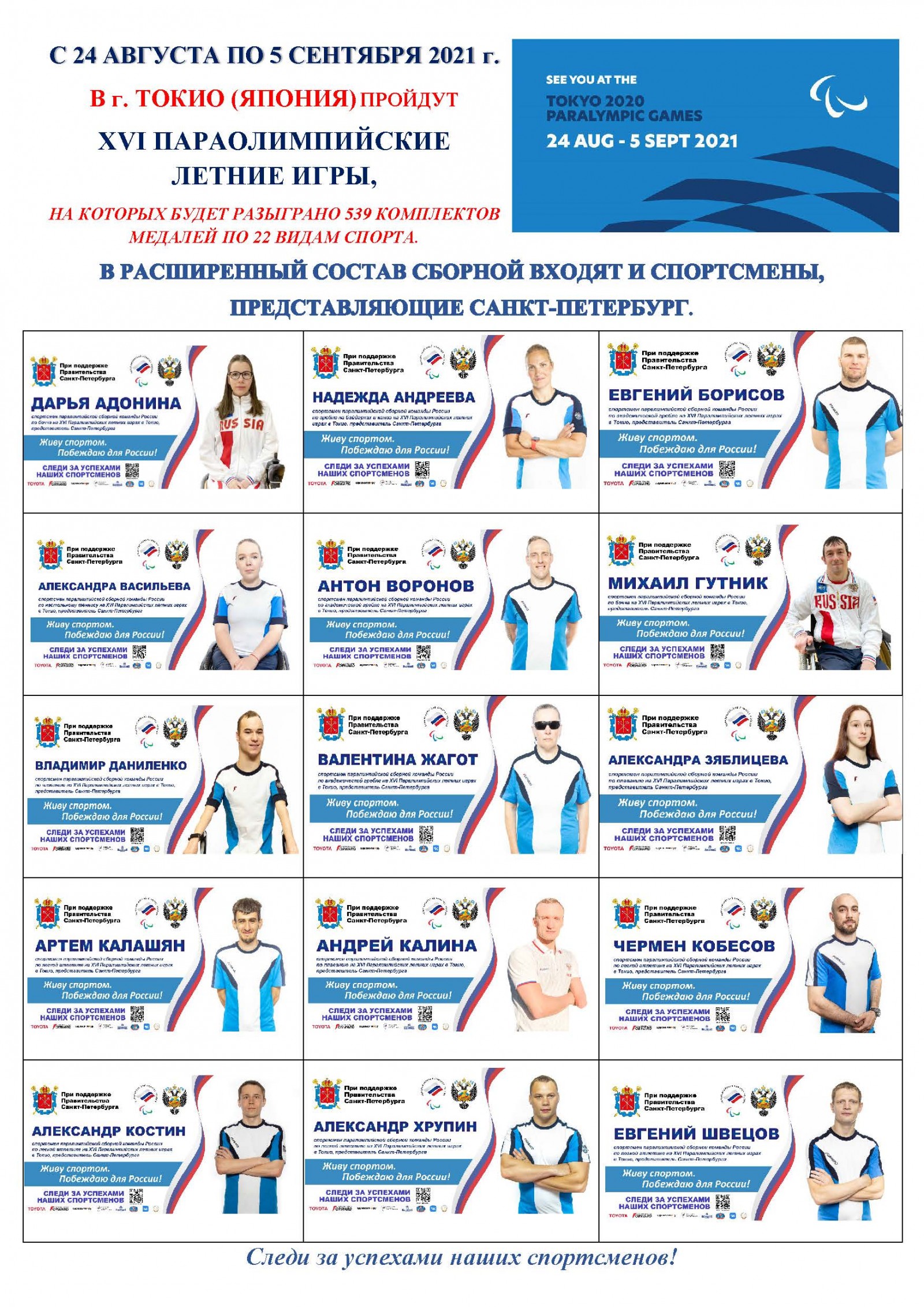 C 24 АВГУСТА ПО 5 СЕНТЯБРЯ 2021 г. В г. ТОКИО (ЯПОНИЯ) ПРОЙДУТ XVI ПАРАОЛИМПИЙСКИЕ ЛЕТНИЕ ИГРЫ, НА КОТОРЫХ БУДЕТ РАЗЫГРАНО 539 КОМПЛЕКТОВ МЕДАЛЕЙ ПО 22 ВИДАМ СПОРТА. В РАСШИРЕННЫЙ СОСТАВ СБОРНОЙ ВХОДЯТ И СПОРТСМЕНЫ, ПРЕДСТАВЛЯЮЩИЕ САНКТ-ПЕТЕРБУРГ.