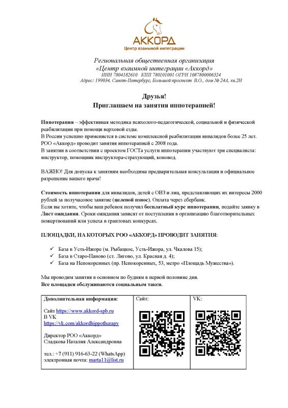 РОО «АККОРД» проводит занятия по иппотерапии