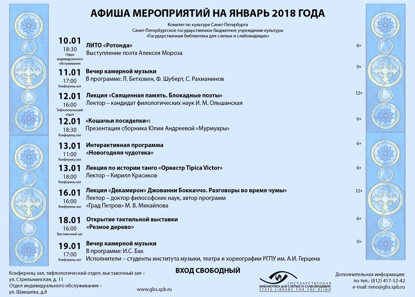 Мероприятия, которые пройдут в Санкт-Петербургской библиотеке для слепых и слабовидящих в январе 2018 года |