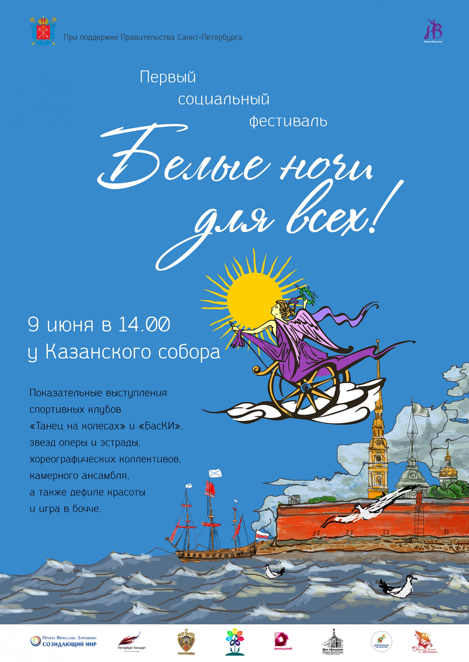 ФЕСТИВАЛЬ «БЕЛЫЕ НОЧИ ДЛЯ ВСЕХ!»![]() ПРАВИТЕЛЬСТВО САНКТ-ПЕТЕРБУРГА ФОНД ПОДДЕРЖКИ СОЦИАЛЬНЫХ И КУЛЬТУРНЫХ ИНИЦИАТИВ «НОВАЯ ВЫСОТА» ФЕСТИВАЛЬ «БЕЛЫЕ НОЧИ ДЛЯ ВСЕХ!» 9 июня 2018 года у Казанского собора 14.00-16.00 Фонд поддержки социальных и культурных инициатив «Новая высота», СПб ГБУК «Петербург-Концерт», СПб ГБУСОН «Центр социальной реабилитации инвалидов и детей-инвалидов Фрунзенского района СПб», Санкт-Петербургская общественная организация инвалидов «Спортивный клуб «Танец на колёсах», Санкт-Петербургская общественная организация физкультурно-спортивный клуб инвалидов «БасКИ» История знает немало примеров, когда сила духа, упорство и терпение помогали людям с ограниченными физическими возможностями здоровья добиваться невероятных успехов, они во многом могут дать фору тем, кого принято считать здоровыми. В Санкт-Петербурге немало делается для того, чтобы «колясочникам» город был и ближе, и доступнее. Но многое предстоит сделать. И проблема внимательности, терпимости, уважения иногда во много раз важнее наличия пандуса или специального лифта. Воспитание человечности и бережного отношения к тем, кто нуждается в помощи, начинается еще в семье. Поэтому Фонд «Новая высота», чья основная деятельность связаны именно с семейной сферой, представляет новый проект – первый социальный фестиваль «Белые ночи для всех!». В период белых ночей, когда город наводнен туристами, когда для самих горожан прогулка по Невскому проспекту один из любимых видов отдыха, 9 июня в 14.00 у Казанского собора состоится фестиваль «Белые ночи для всех!». Выступления под открытым небом спортсменов клуба «Танец на колёсах», спортивного баскетбольного клуба «Баски», дефиле девушек конкурса «Невская краса», а также звезд эстрады составят концертную программу фестиваля. Контакты: Тел./факс: (812)312-02-20, 191002, г. Санкт-Петербург, ул. Ломоносова, дом 16, лит.А, пом.15-Н Сайт: www.newrise.ru |
