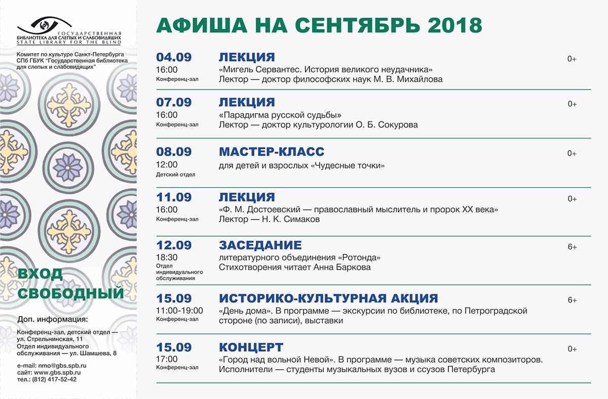 Мероприятия Санкт-Петербургской библиотеки для слепых и слабовидящих в сентябре![]() Дорогие друзья! Приглашаем вас посетить мероприятия Санкт-Петербургской библиотеки для слепых и слабовидящих, которые пройдут в первой половине сентября. |