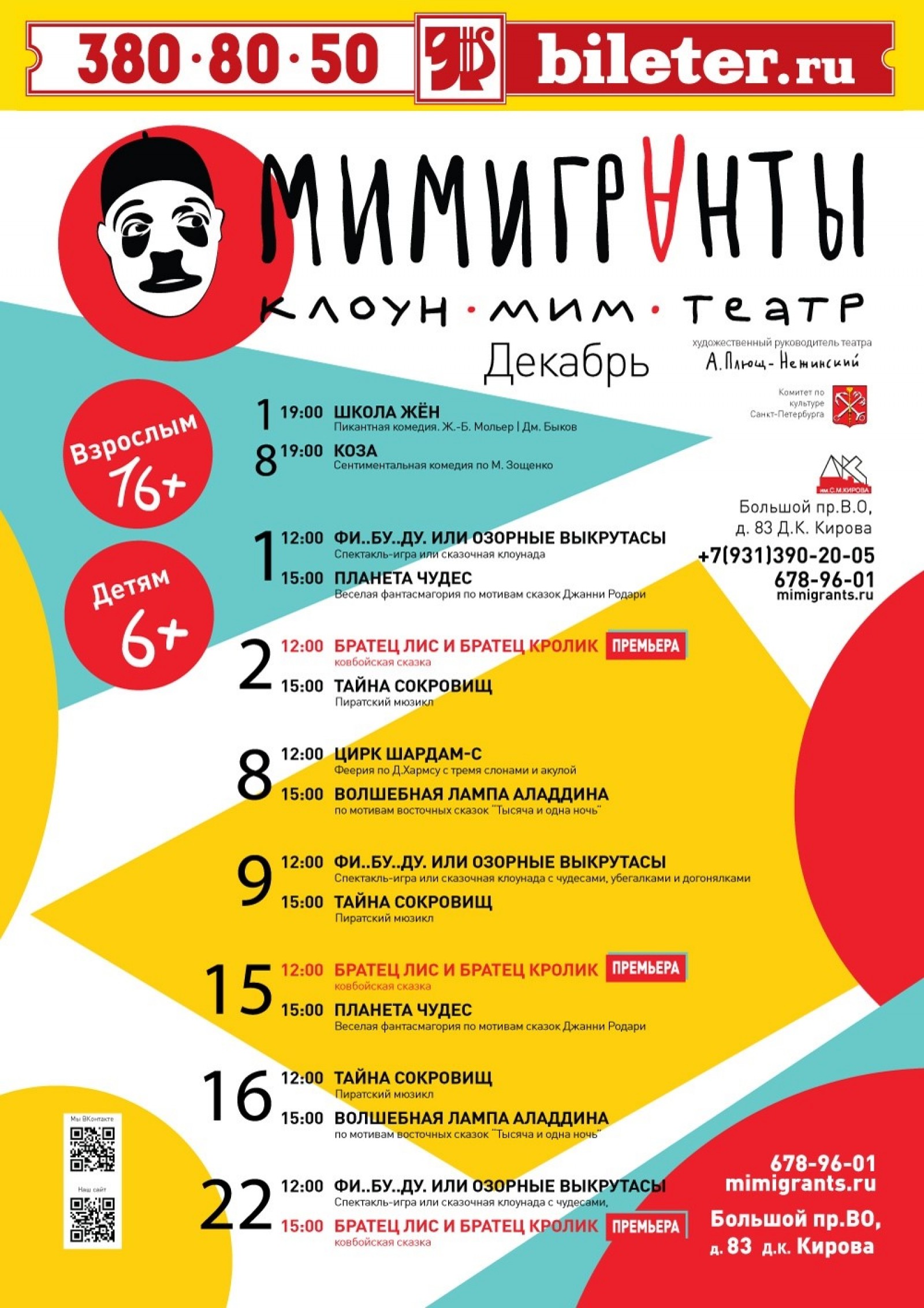 «Клоун-мим-театр “МимИГРАнты”» устанавливает льготные цены![]() ВНИМАНИЕ! В мае 2018 года СПб ГБУК «Клоун-мим-театр “МимИГРАнты”» устанавил льготные цены на билеты в рамках реализации государственного задания и осуществления мероприятий по поддержке «льготных групп», малоимущих и малообеспеченных слоёв населения и развития театрального культурного пространства Санкт-Петербурга и Ленобласти только на репертуарные постановки. Стоимость льготного билета на спектакли для детей – 200 руб. Стоимость льготного билета на спектакли для взрослых – 300 руб. ОБРАЩАЕМ ВАШЕ ВНИМАНИЕ НА ТО, ЧТО НА ДЕТСКИЕ СПЕКТАКИ ИМЕЮТСЯ ВОЗРАСТНЫЕ ОГРАНИЧЕНИЯ 5 + На спектакль Фи..Бу..Ду.. или озорные выкрутасы допускаются дети в возрасте 4+
