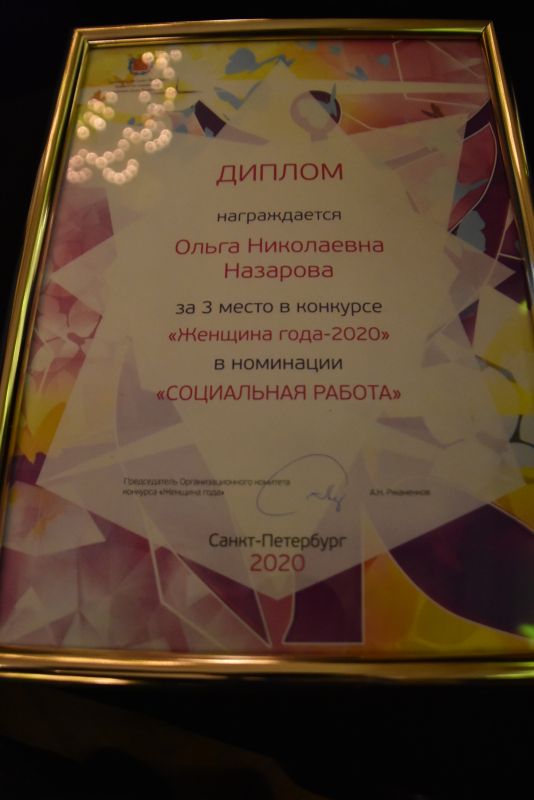 Торжественная церемония подведения итогов конкурса «Женщина года» 04.03.2020В канун главного женского праздника в рамках программы «Петербург и петербуржцы» в Санкт-Петербурге проходил конкурс «Женщина года», организованный при поддержке Правительства Санкт-Петербурга. На протяжении многих лет конкурс «Женщина года» является одним из самых ярких событий Санкт-Петербурга. 4 марта в Таврическом дворце состоялась торжественная церемония подведения итогов конкурса. Мы рады сообщить, что Ольга Николаевна Назарова, директор нашего Центра, заняла 3 место в номинации «Социальная работа». Поздравляем!