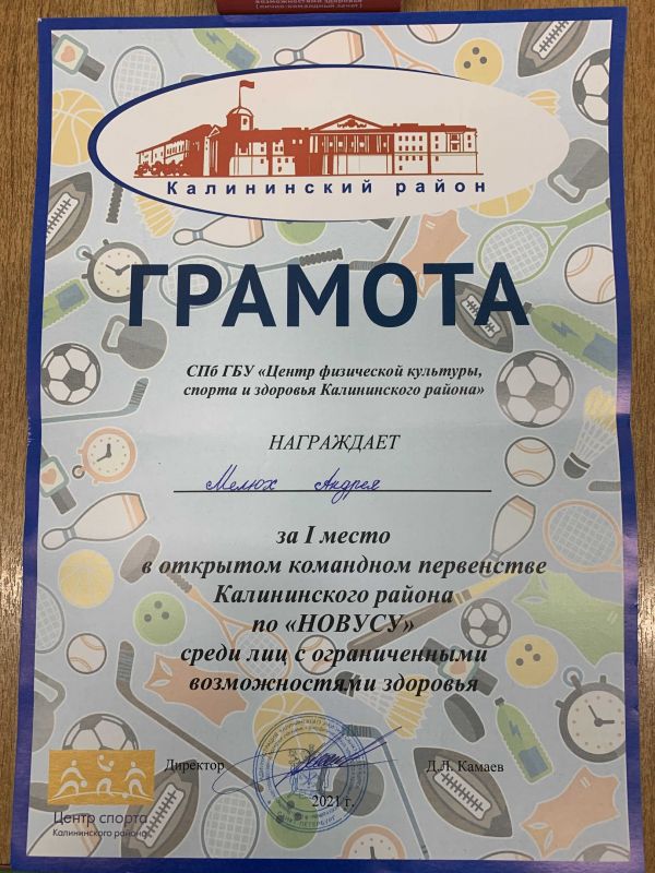 Участие в открытом первенстве Калининского района по «Новусу» 30.11.2021![]() 30 ноября наши спортсмены приняли участие в открытом первенстве Калининского района по «Новусу» среди лиц с ограниченными возможностями. Всего на мероприятии присутствовало 36 человек из 14 районов города. Мы от всей души поздравляем Дмитрия Игонина, показавшего очень хороший результат, и Андрея Мелюха, который, несмотря на то, что пока является новичком, занял I место! Отдельное поздравление Вячеславу Васильевичу Суетнову, тренеру спортсменов, инструктору-методисту по адаптивной физической культуре и спорту нашего Центра. Молодцы! Так держать!