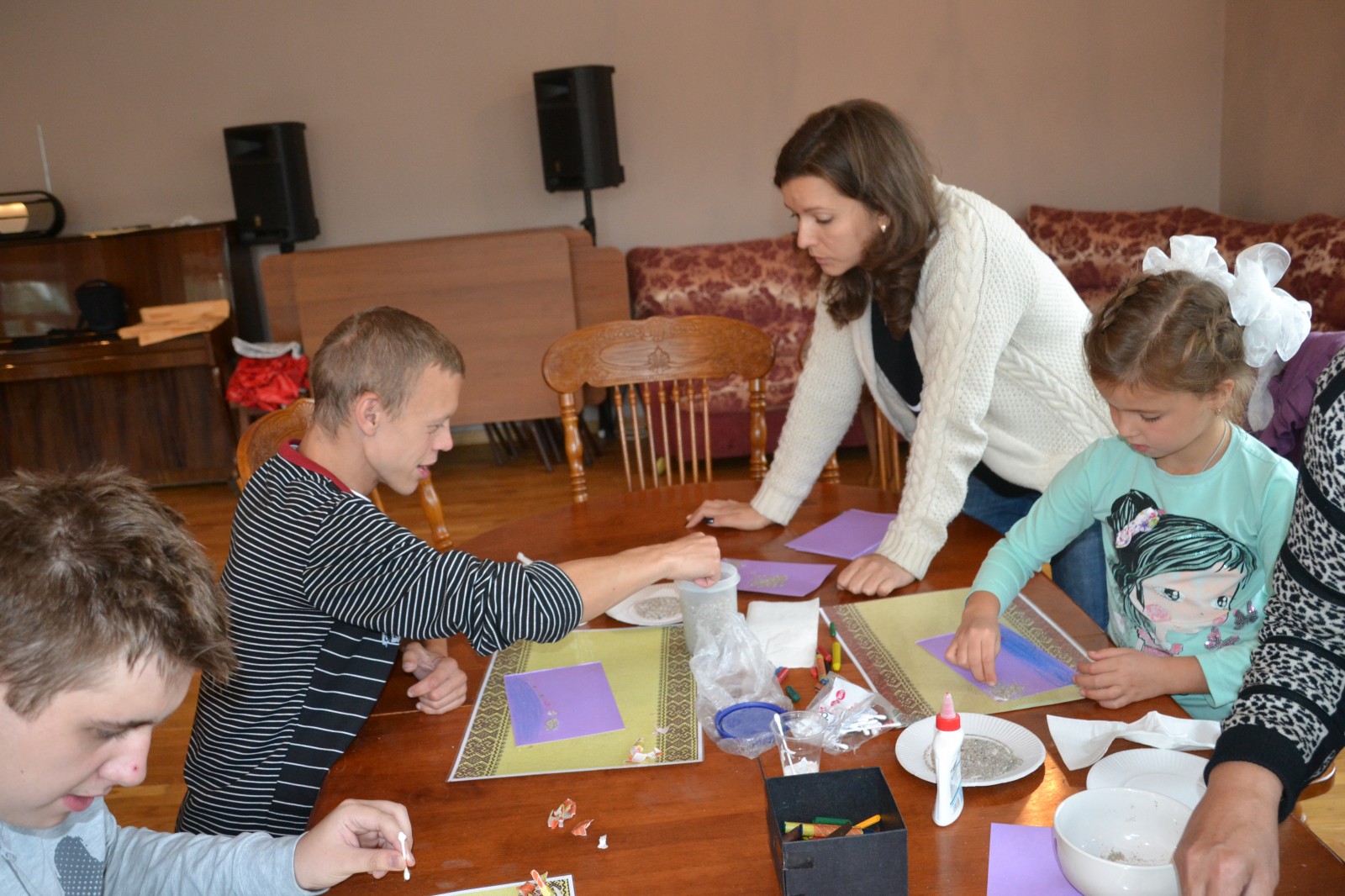 Посещение ДК "Досуг" 13.09.1713 сентября состоялось посещение практического занятия «Морские обитатели». Сотрудник ДК «Досуг» предложила ребятам изобразить при помощи разноцветных восковых мелков подводный мир и его обитателей. Все увлеченно приступили к работе. Спустя некоторое время на бумаге стали появляться причудливые жители подводного мира. Когда рисунки были готовы, специалист предложил взять ватные палочки и замазать клеем морских обитателей, а затем засыпать их морским песком. Песок приклеился и рисунки получились объёмными и «живыми». Все остались очень довольны своими работами.